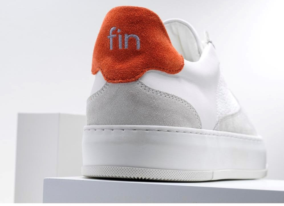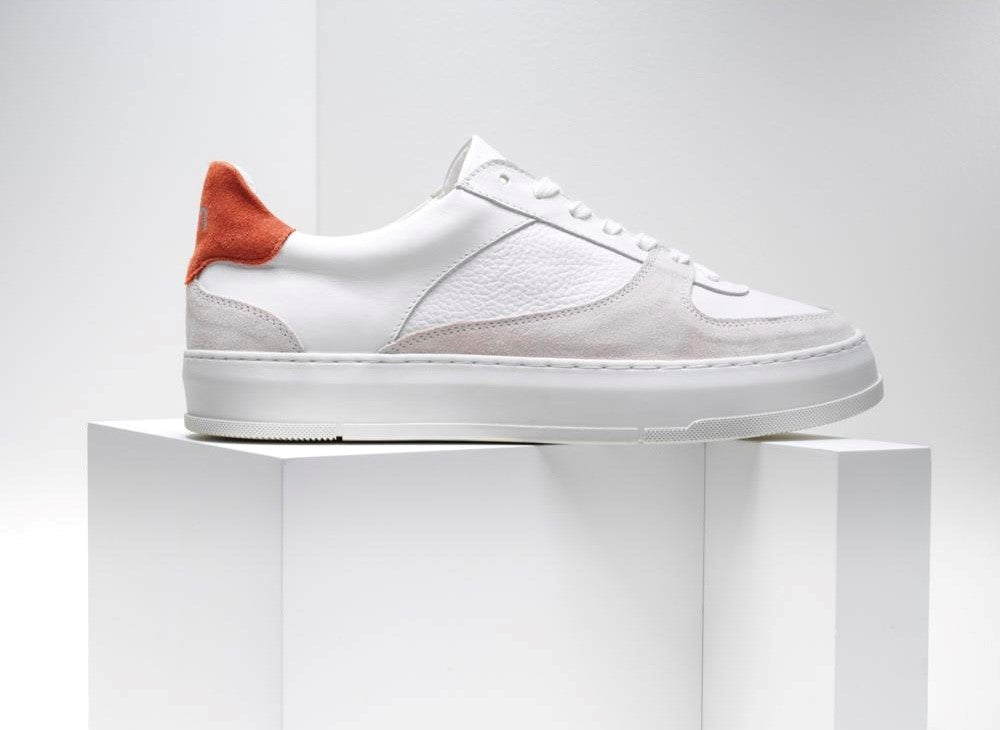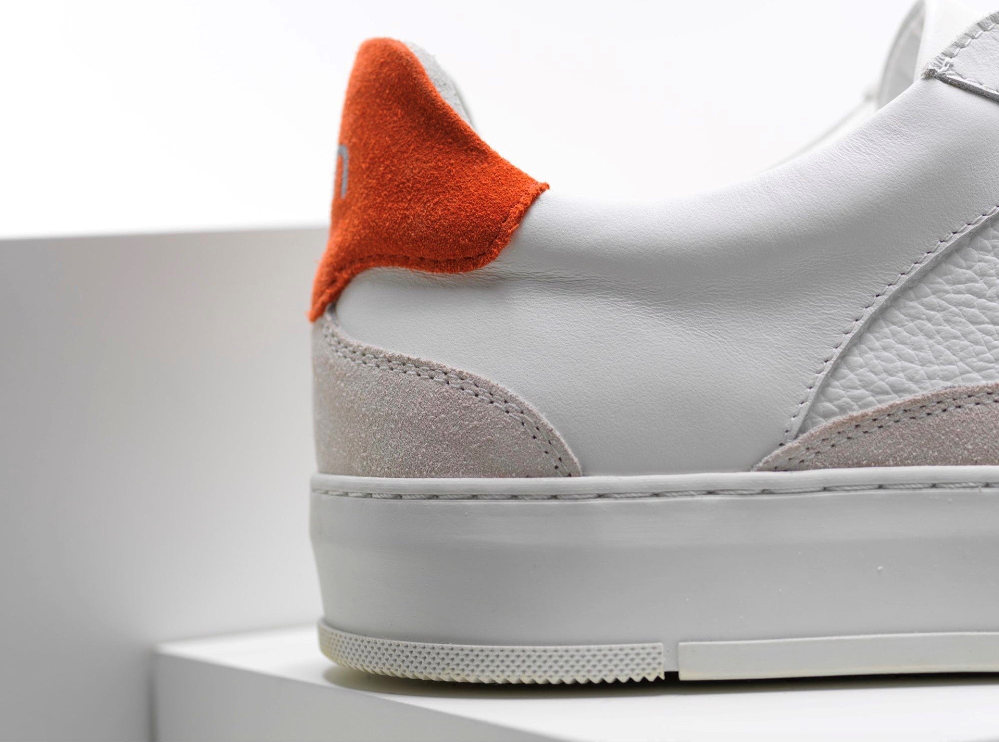 This design has a warmer seasonal feel, with a bone suede contrasting against a burnt mango heel.